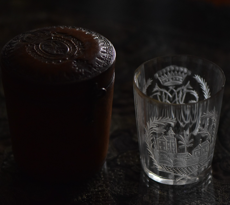 1759年頃のグラス。ファソン・ド・ボエムと呼ばれるボヘミア風デザインのグラス。旅行用で、フランス王室の紋章が入った革ケースが付属する。